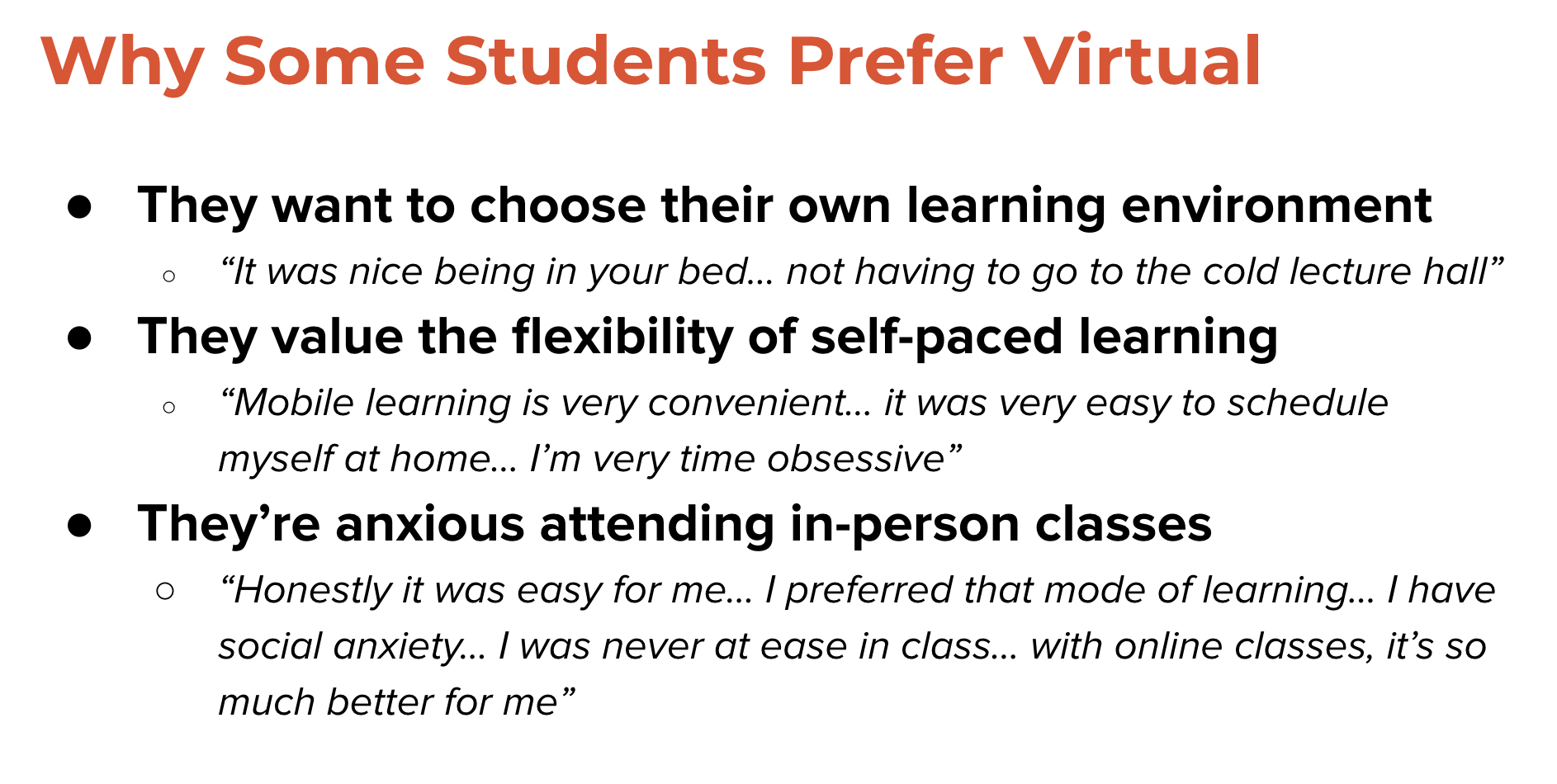 In the top-right quadrant (high access, preference for virtual learning), we see an opportunity to connect these students to more virtual programs, leveraging their preference for digital learning environments. The question here becomes, “How might we connect high-access students that prefer online learning to new virtual programs?”