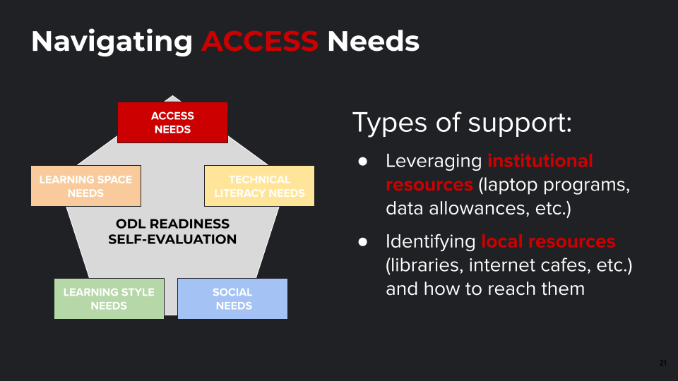In the top-left quadrant (low access, preference for virtual learning), the challenge is how to provide these students with the tools they need to succeed despite unreliable access to resources like WiFi or electricity. The question posed is, “How might we give low-access students that prefer online learning the tools they need?”