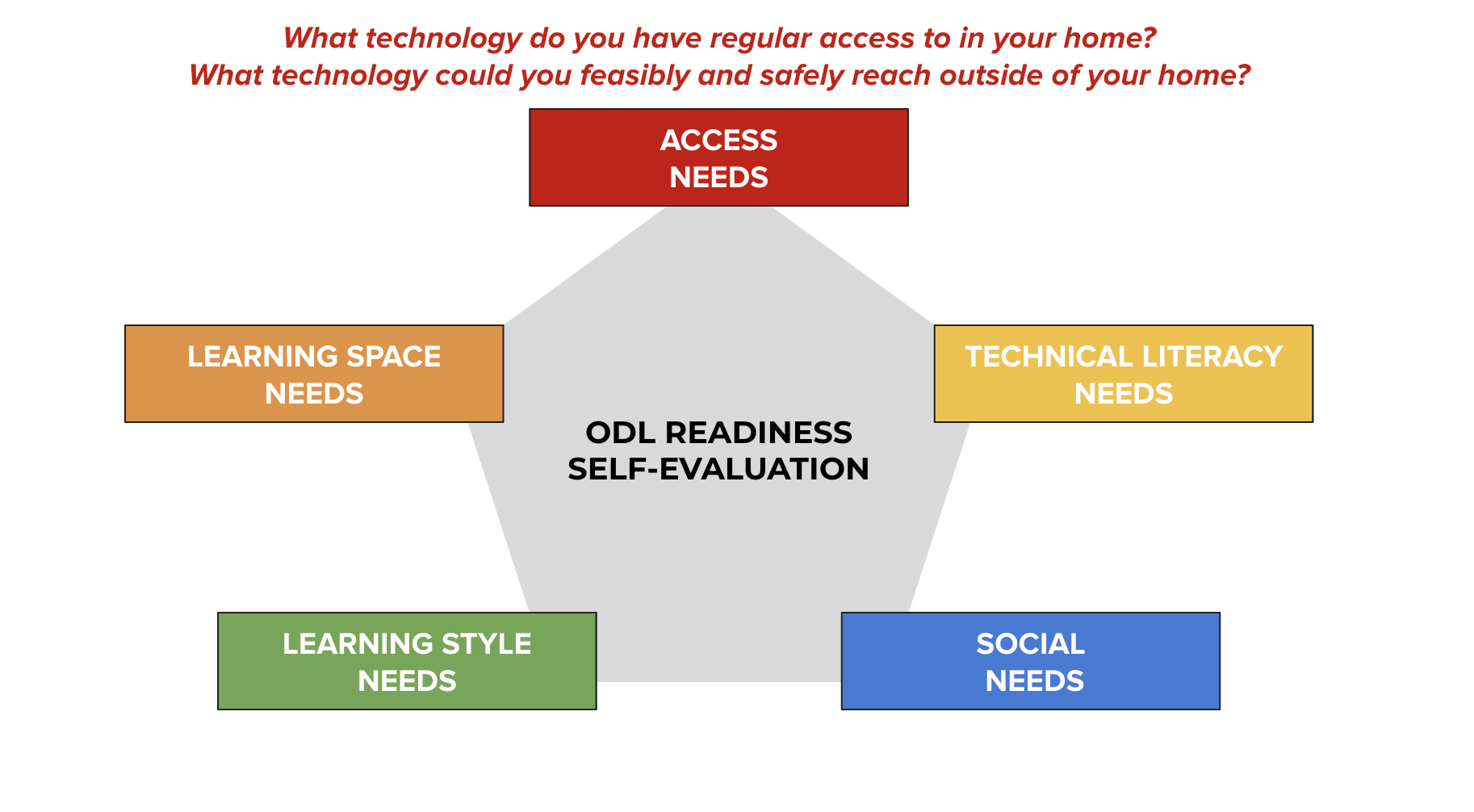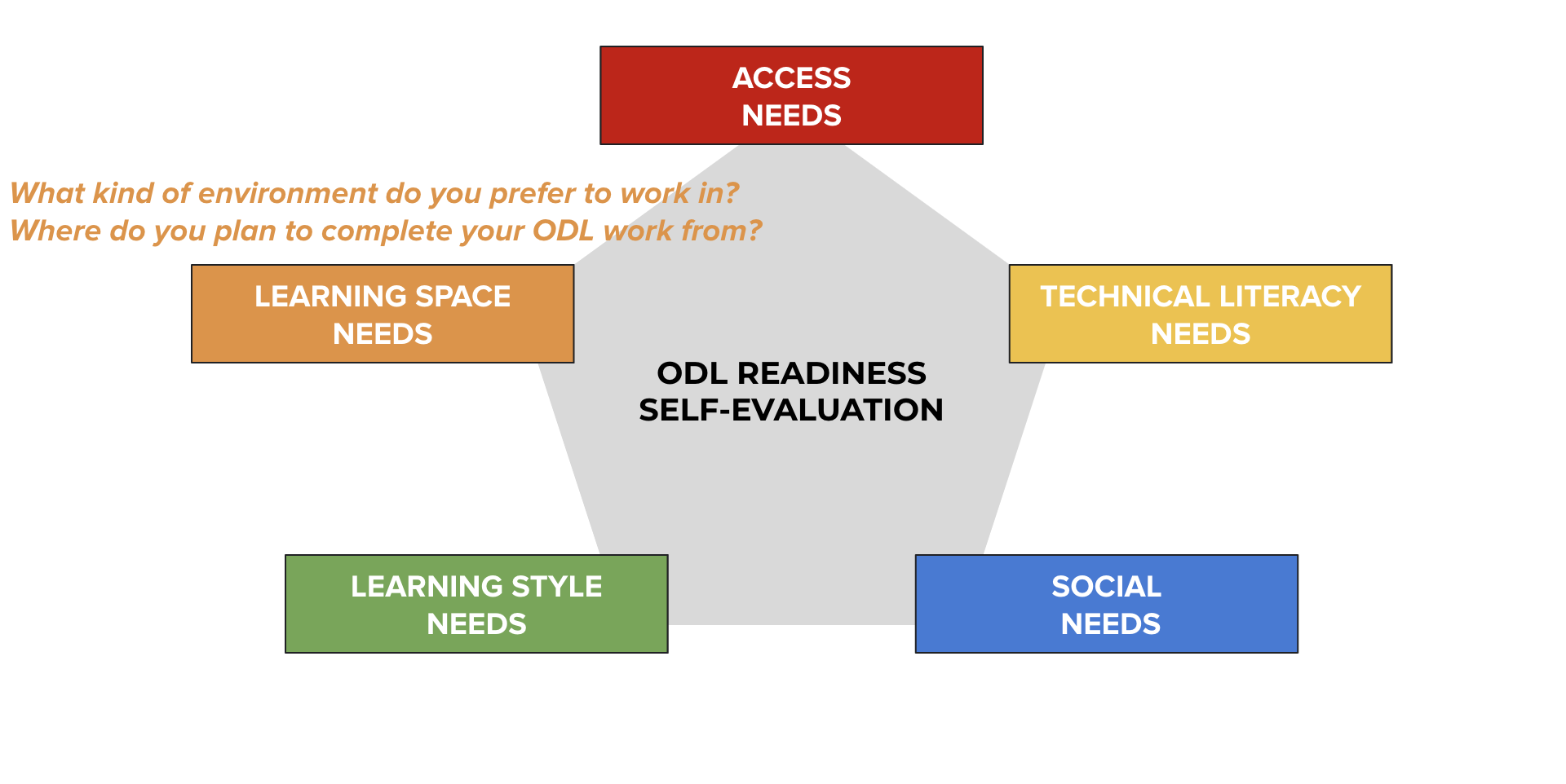 To address the first challenge, we developed the concept of an ODL Readiness Self-Evaluation. This tool is designed to help students assess their preparedness for online learning. Below is a brief mockup of the tool, along with an outline of what it would evaluate.