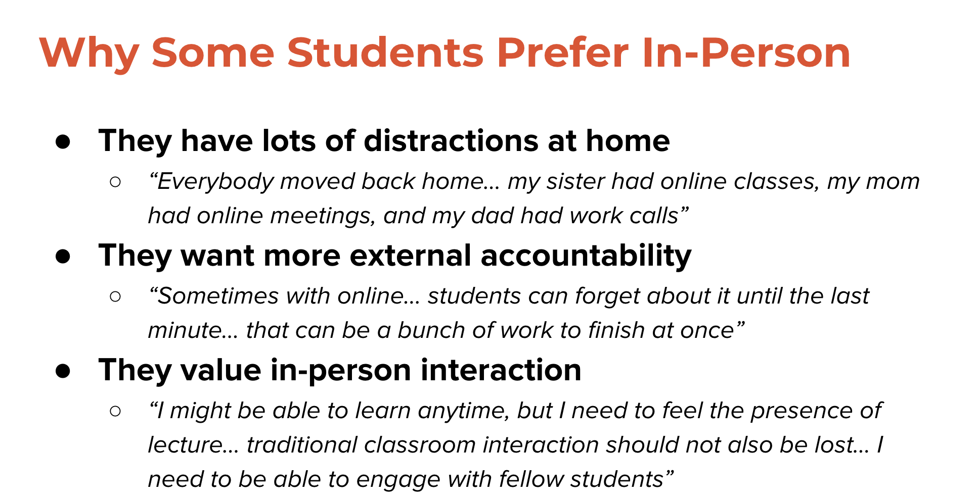 To present students’ needs clearly, we developed a 2x2 matrix to categorize students based on two key factors: learning preference and accessibility to resources. The graphic below illustrates how this matrix helps us identify opportunities to better support different student groups based on their unique needs.