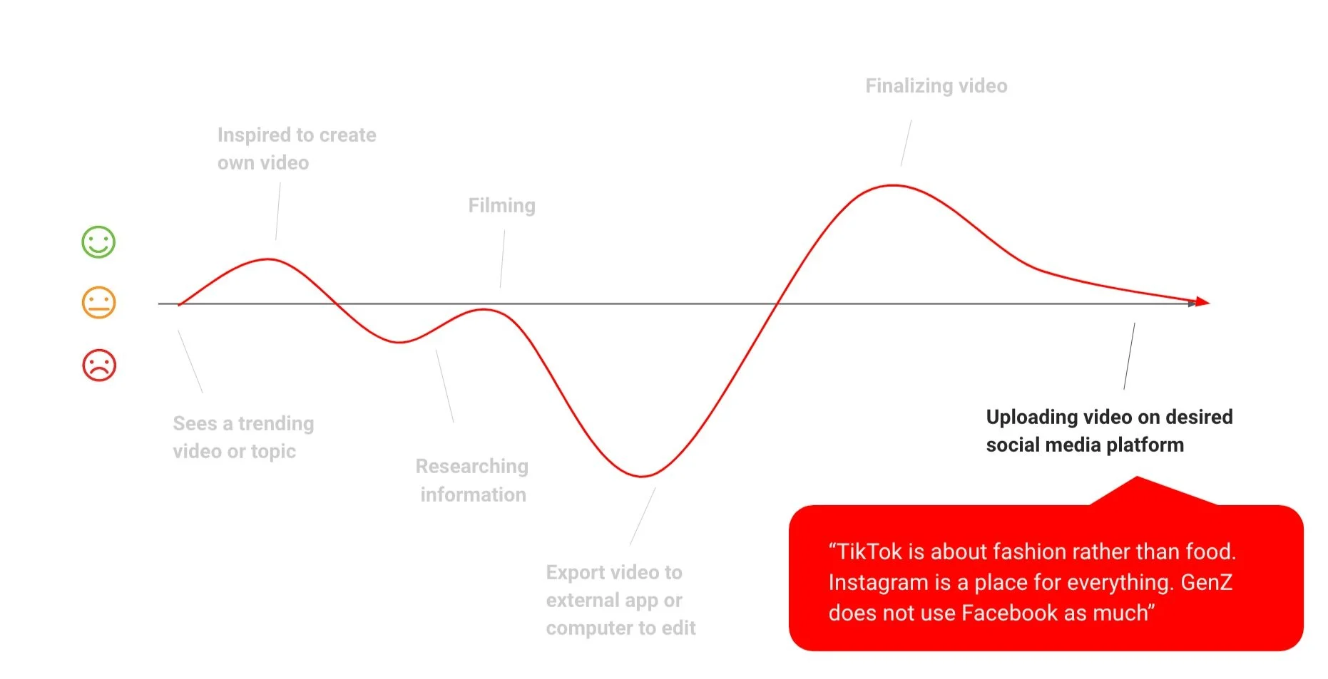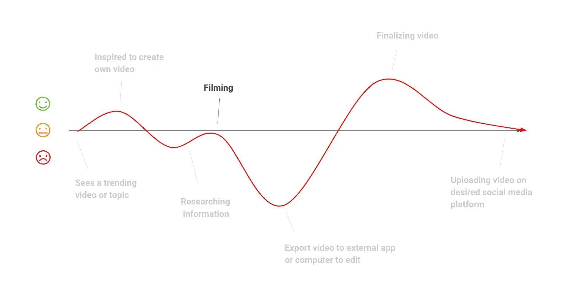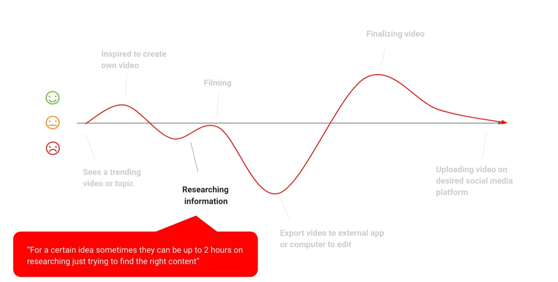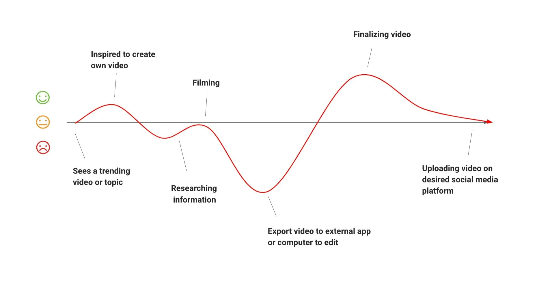 After interviewing creators, we gained insights into their content creation process within their favorite short-form content apps, which we visualized in this journey map. These were the phases of their content creation process: