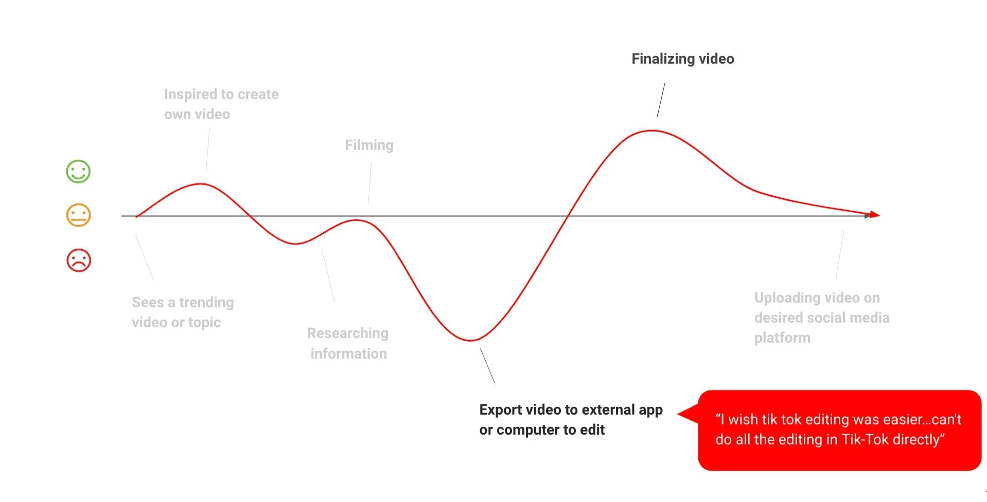 This journey map effectively outlines the stages of the content creation process within the app, capturing moments of user confusion and highlighting opportunities for interface improvement.