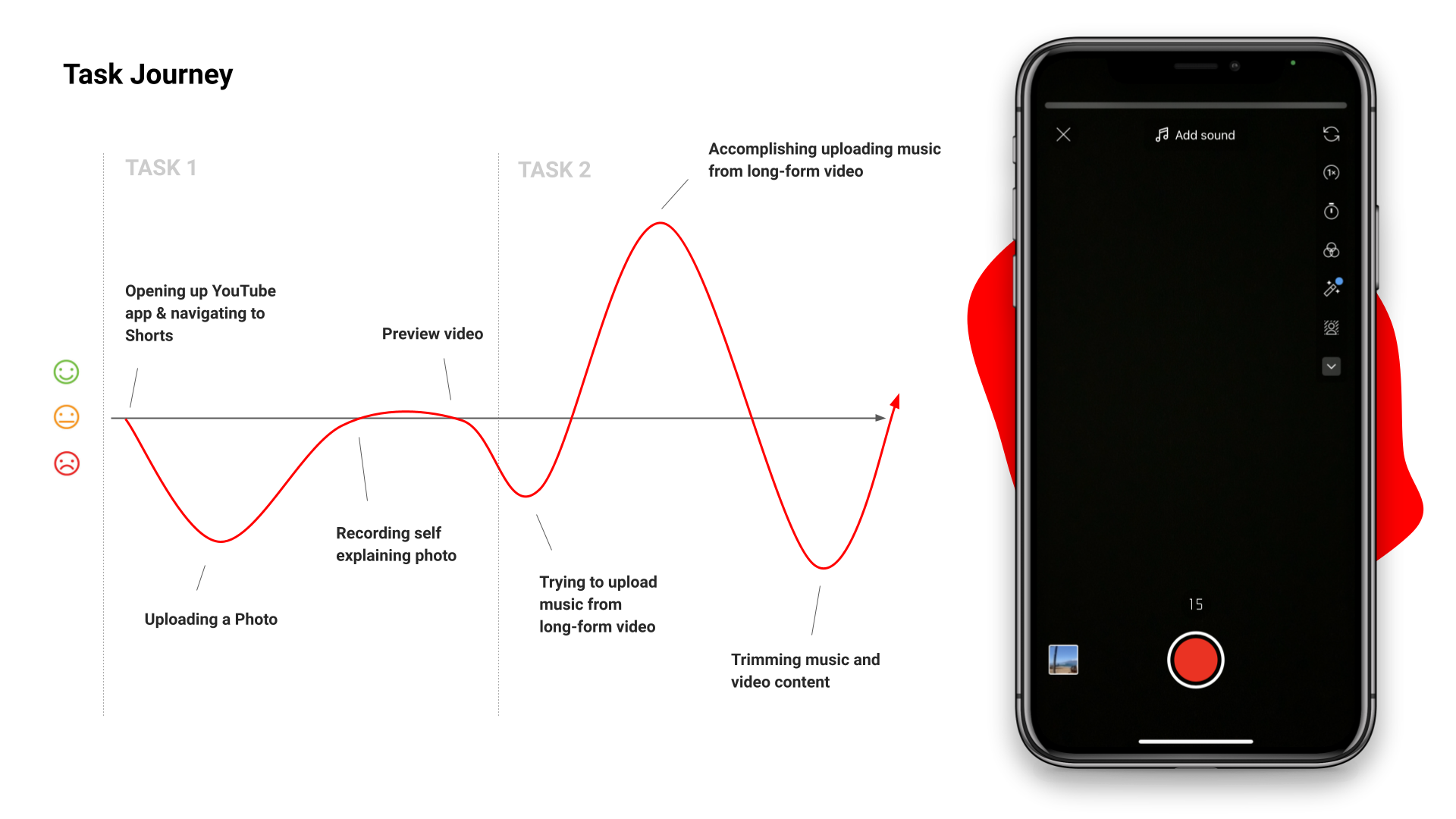 We conducted user interviews to gather in-depth insights into content creators' perspectives on short-form video creation. These interviews included targeted questions to understand their experiences and challenges with similar platforms. Building on these insights, we developed user journey maps to visualize and analyze each stage of the video creation process from the creators' perspective. Due to time constraints, we followed up with three moderated usability tests specifically focused on evaluating the natural flow of content creation within YouTube Shorts, providing us with qualitative and actionable insights for enhancing the user experience.